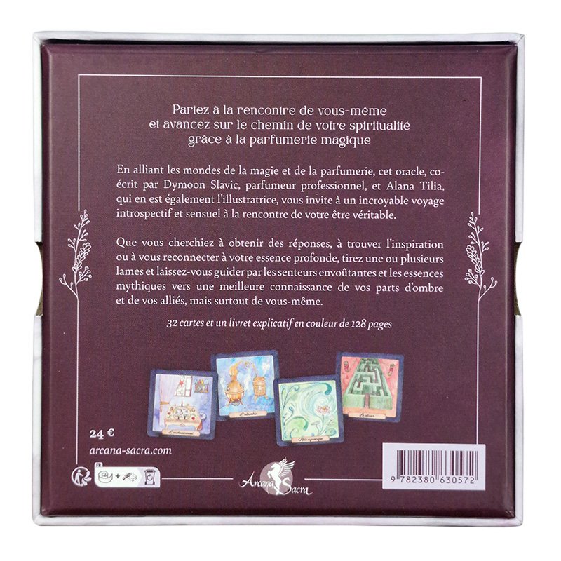 Partez à la rencontre de vous-même et avancez sur le chemin de votre spiritualité grâce à la parfumerie magique. En alliant les mondes de la magie et de la parfumerie, cet oracle, co-écrit par Dymoon Slavic, parfumeur professionnel, et Alana Tilia, qui en est également l’illustratrice, vous invite à un incroyable voyage introspectif et sensuel à la rencontre de votre être véritable. Que vous cherchiez à obtenir des réponses, à trouver l’inspiration ou à vous reconnecter à votre essence profonde, tirez une ou plusieurs lames et laissez-vous guider par les senteurs envoûtantes et les essences mythiques vers une meilleure connaissance de vos parts d’ombre et de vos alliés, mais surtout de vous-même.